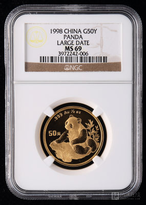 Lot Name: PRC, 1998, Giant Panda 1/2oz Bu gold coin in NGC holder (large date, graded MS69, actual mintage 2,620 pieces).