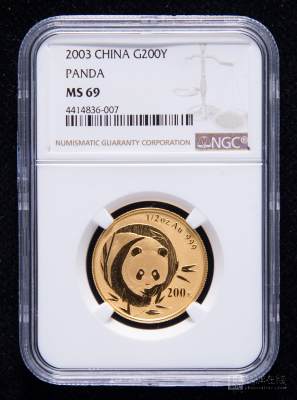 Lot Name: PRC, 2003, Giant Panda 1/2oz Bu gold coin in NGC holder (graded MS69).