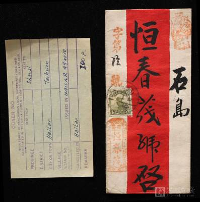 Lot Name: ROC, Red-band cover postally used sent to Shihtao, franked with ROC Junk 4c, tied by double chop.